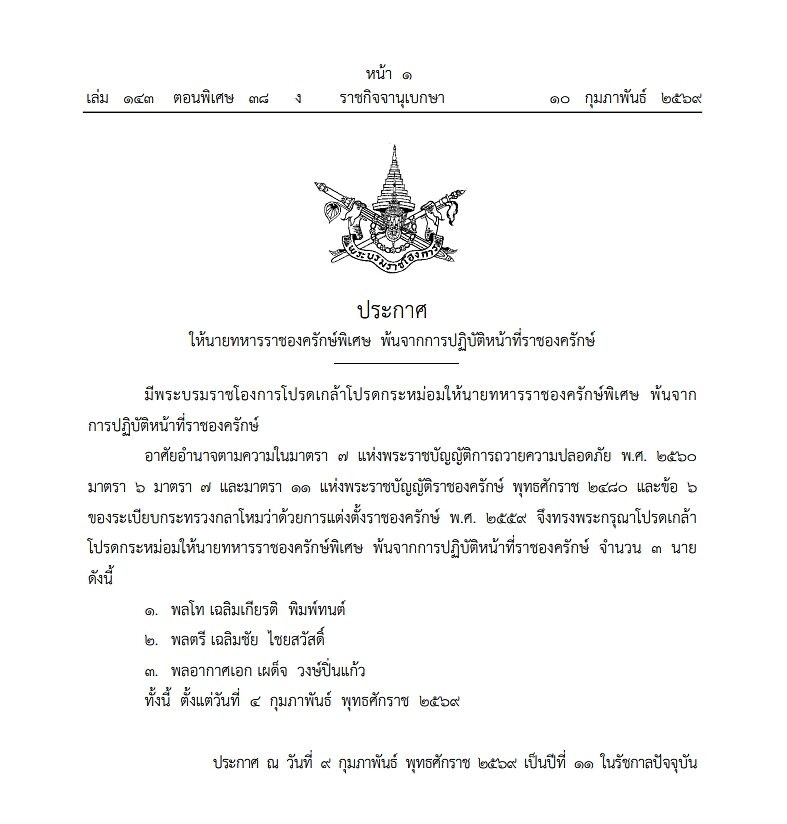 พ้นจากการปฏิบัติหน้าที่ราชองครักษ์ จำนวน 3 นาย ดังนี้ 1.พลโท เฉลิมเกียรติ พิมพ์ทนต์ 2.พลตรี เฉลิมชัย ไชยสวัสดิ์ 3.พลอากาศเอก เผด็จ วงษ์ปิ่นแก้ว ประกาศ ณ วันที่ 9 กุมภาพันธ์ พุทธศักราช 2569 เป็นปีที่ 11 ในรัชกาลปัจจุบัน